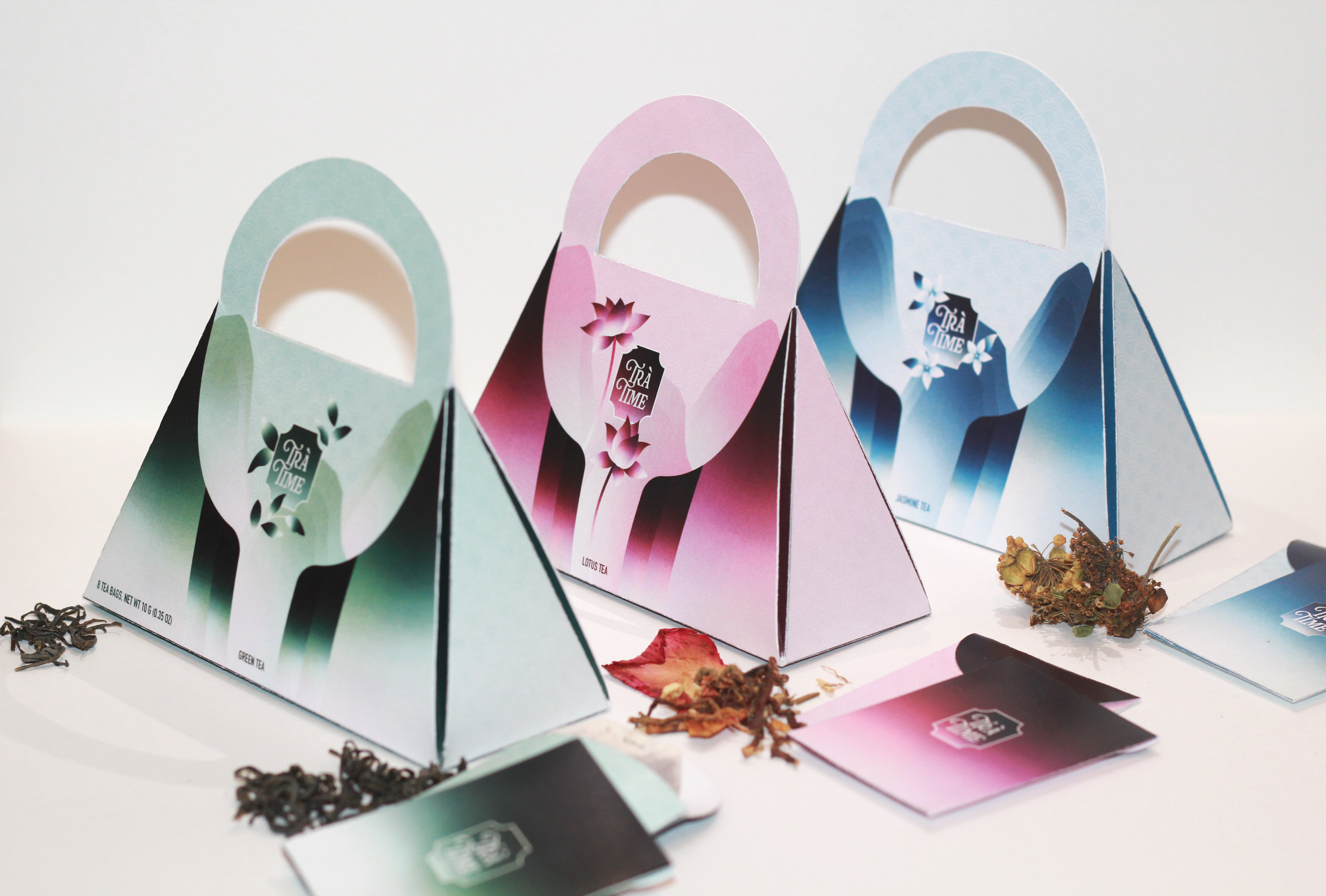 Inspired by the elegance of the áo dài (Vietnamese traditional dress) and the serene mountain landscapes of Vietnam, Trà Time is a tea packaging system that blends traditional silhouettes with modern gradients and textures. Each box- Green, Lotus, and Jasmine- features a unique color scheme and floral iconography that ties to the flavor. The curved handle mimics the neckline of the áo dài. Designed as a physical and visual experience, Trà Time celebrates cultural continuity through thoughtful design.